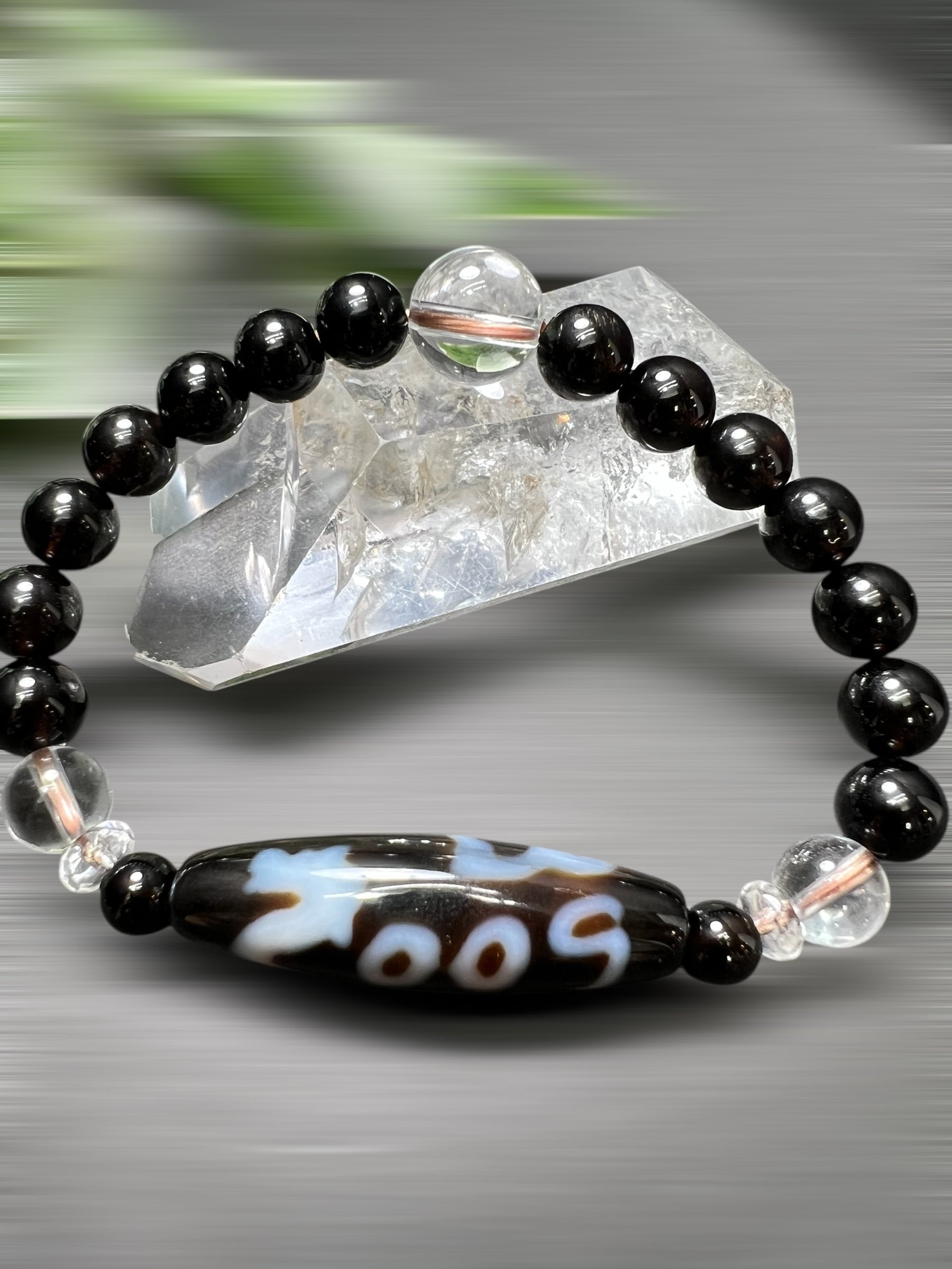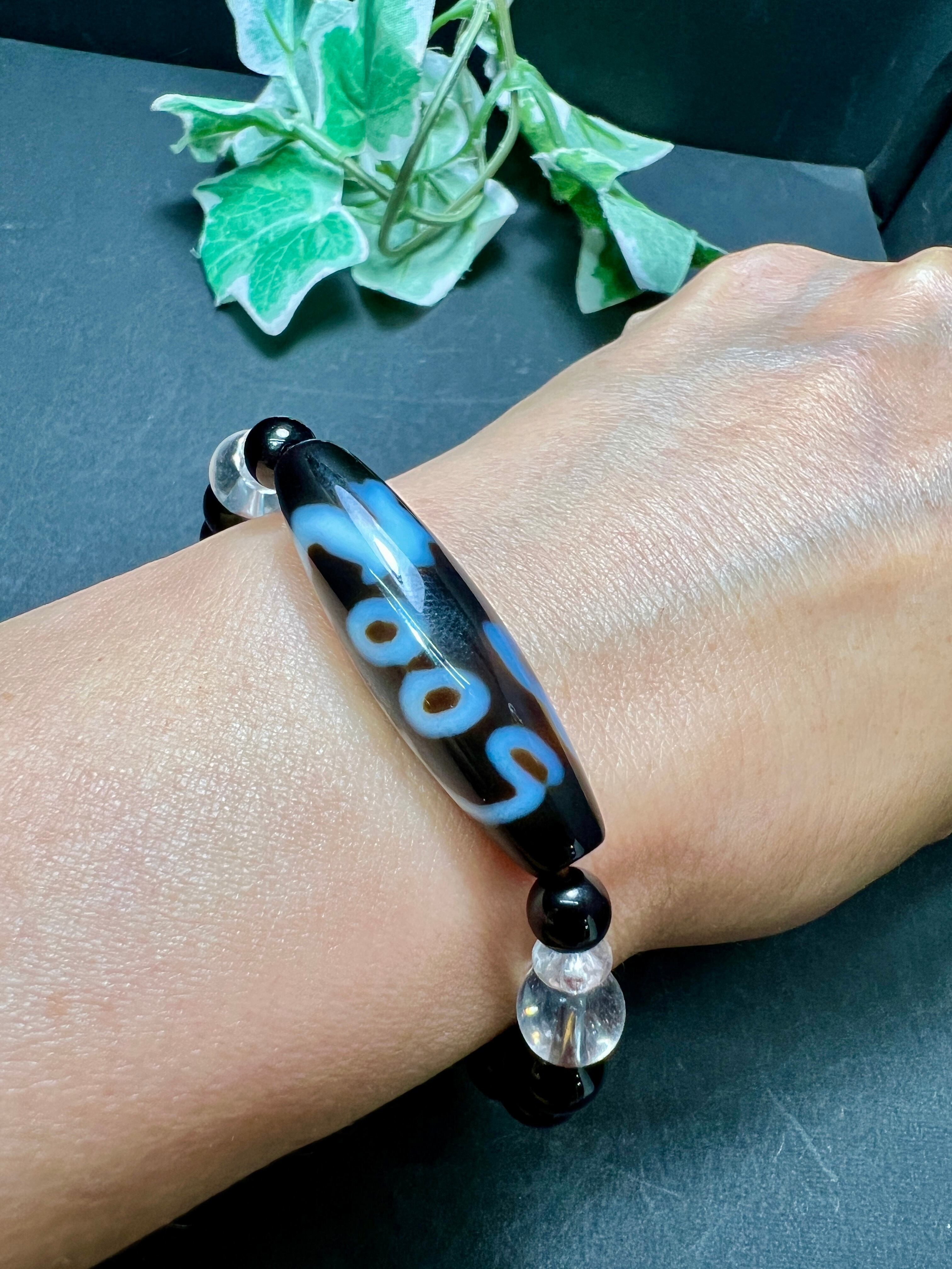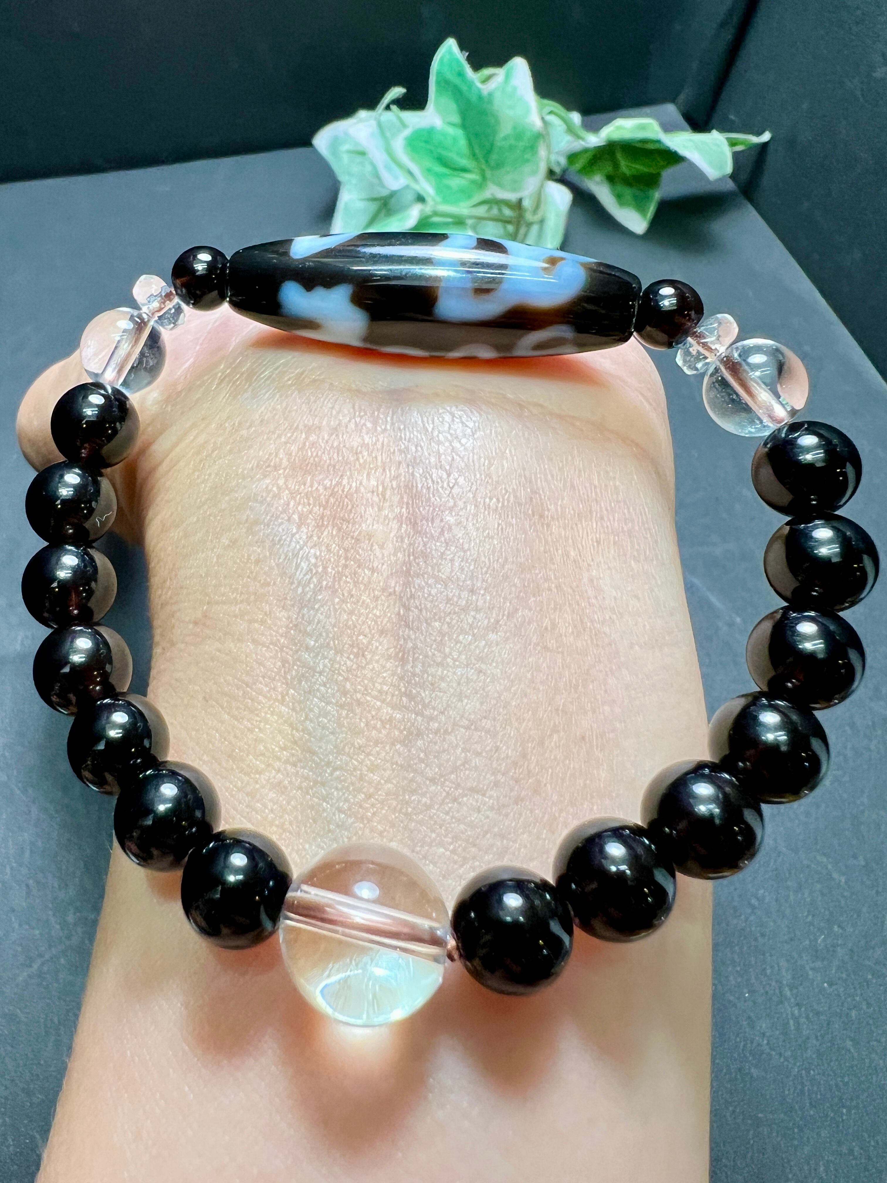 こちらの 龍蓮花三眼天珠 × モリオン(黒水晶)ブレスレット