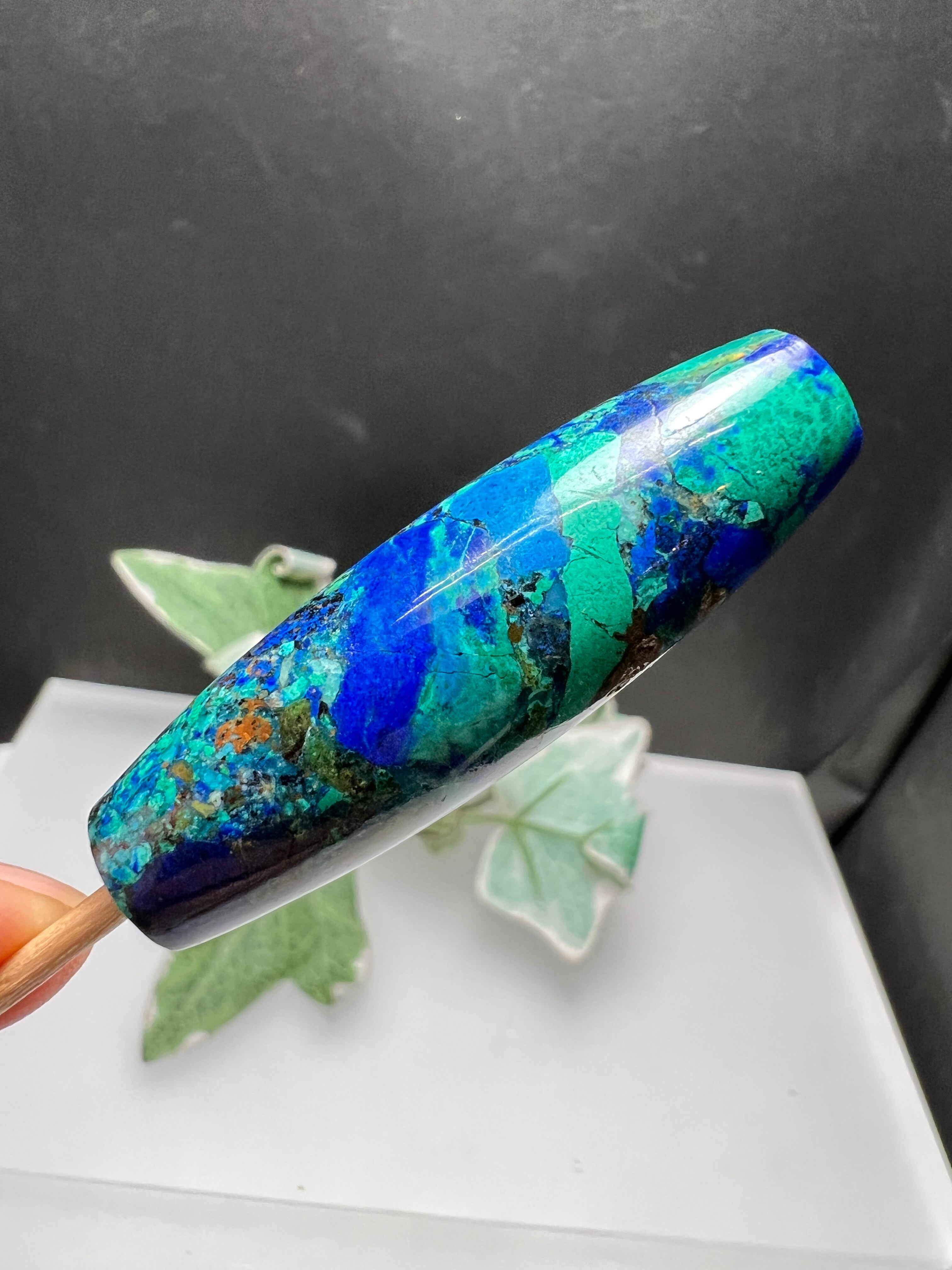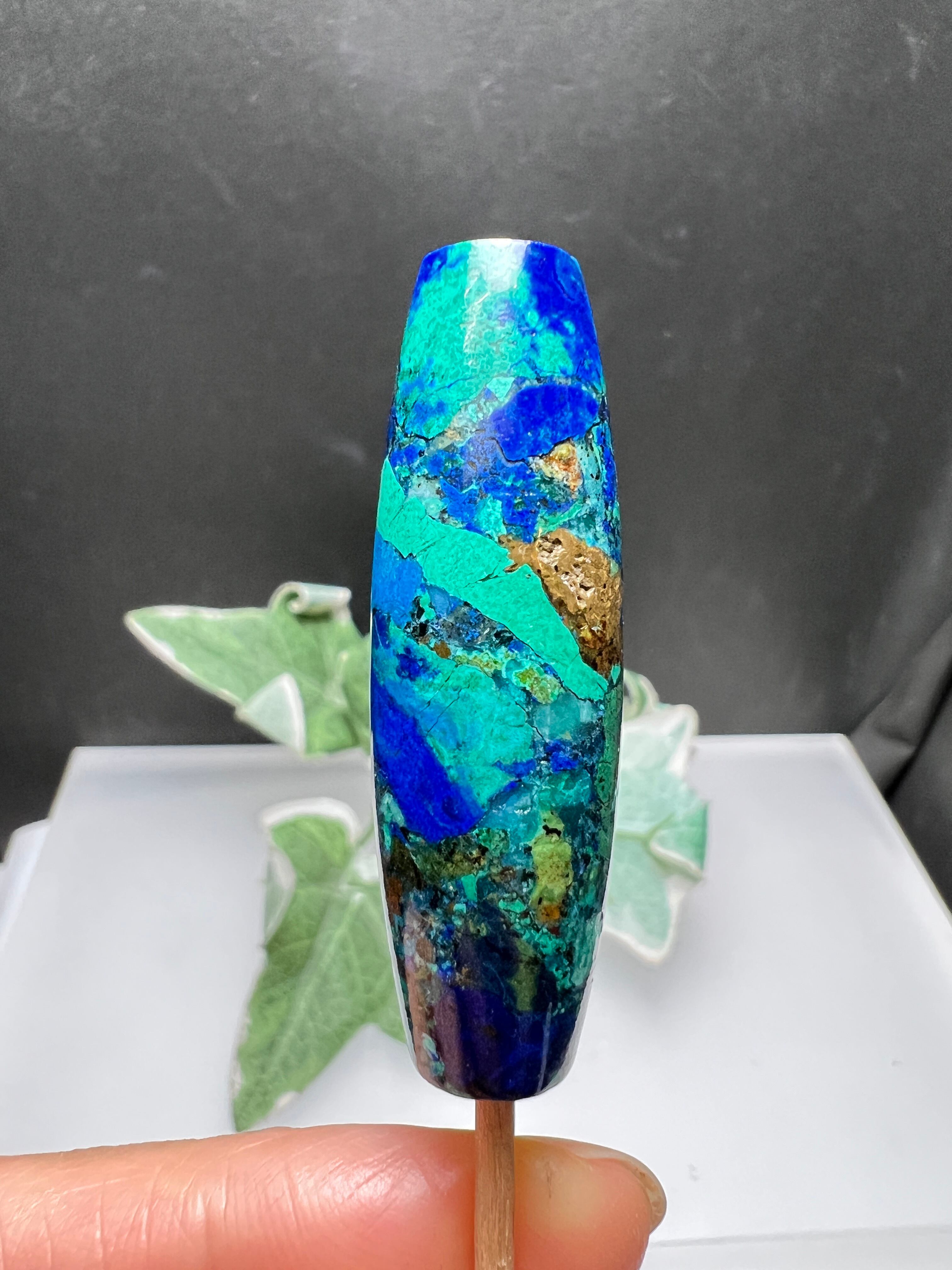 アズマラカイトは、(青)と(緑)が一体となった石で、非常にスピリチュアルな力を持つとされています。天珠型に加工されることで、その力がより集約され、護符的な役割を強めます。