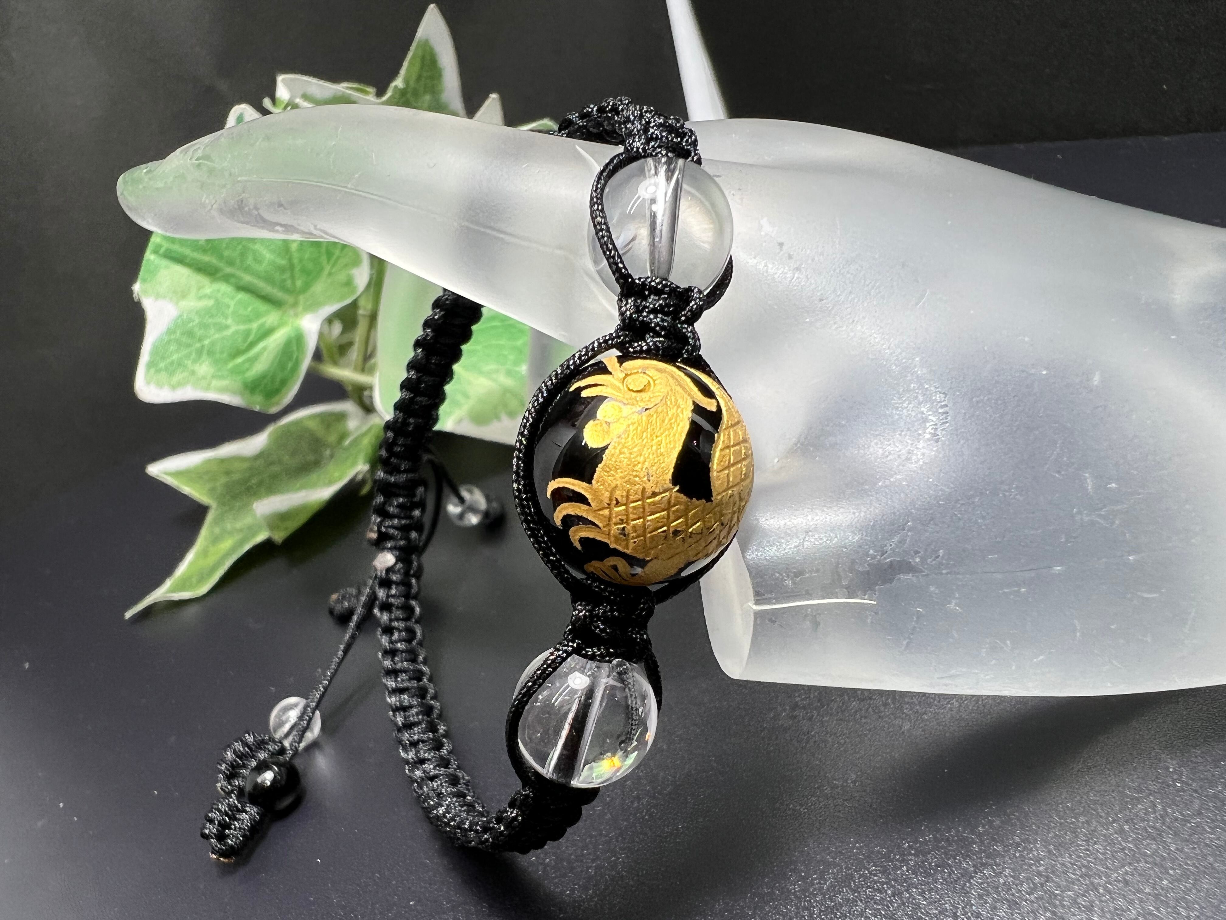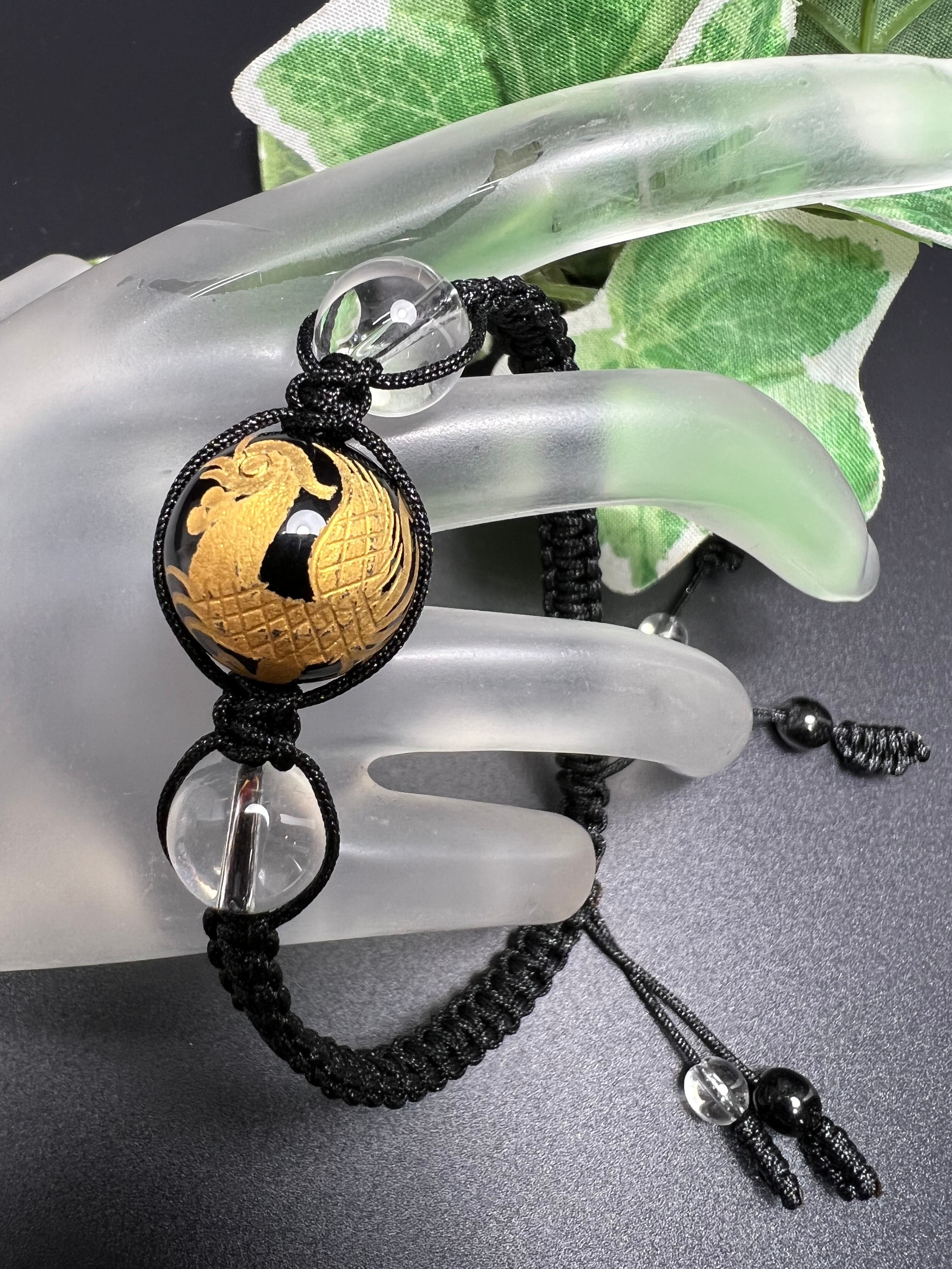 朱雀オニキス彫り&水晶紐ブレスレット❣️パワーストーン 権力up 金運招来 ❣️