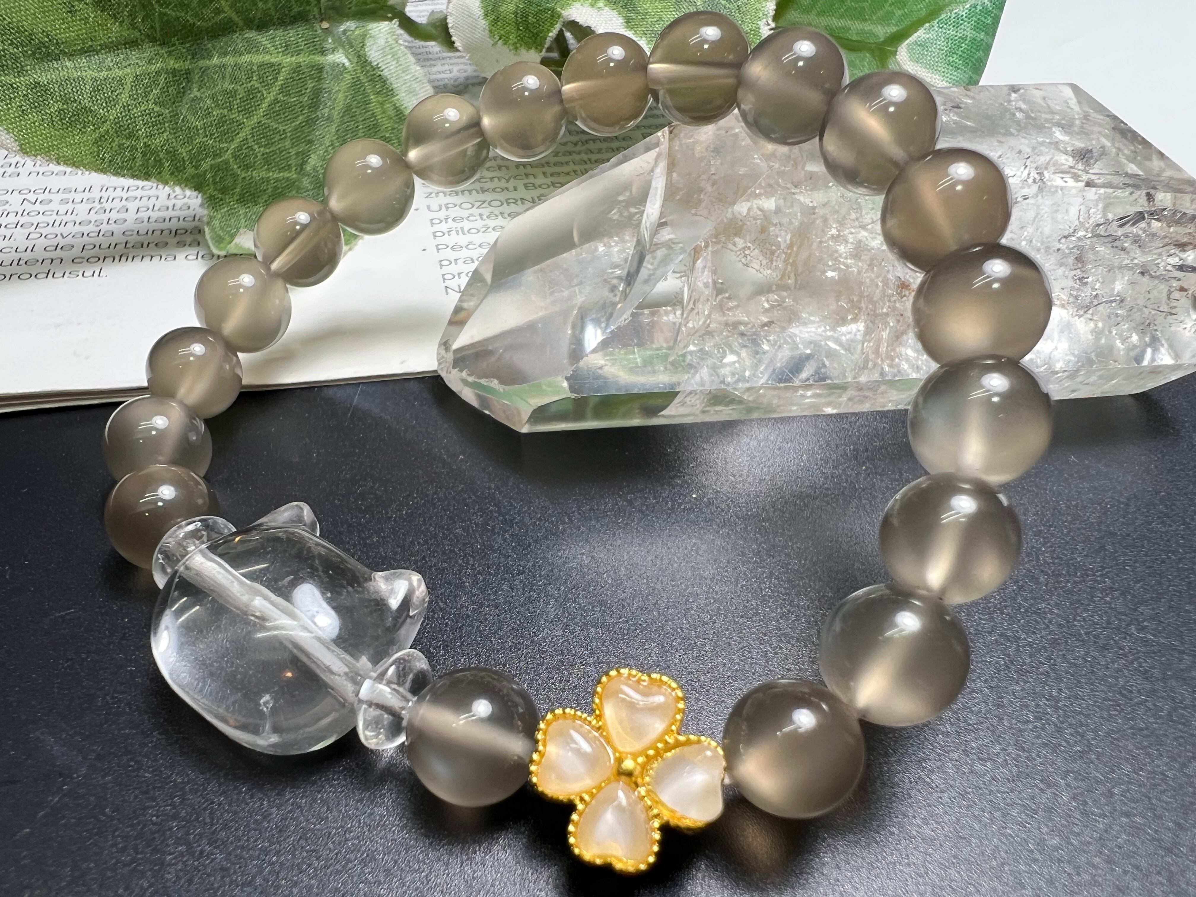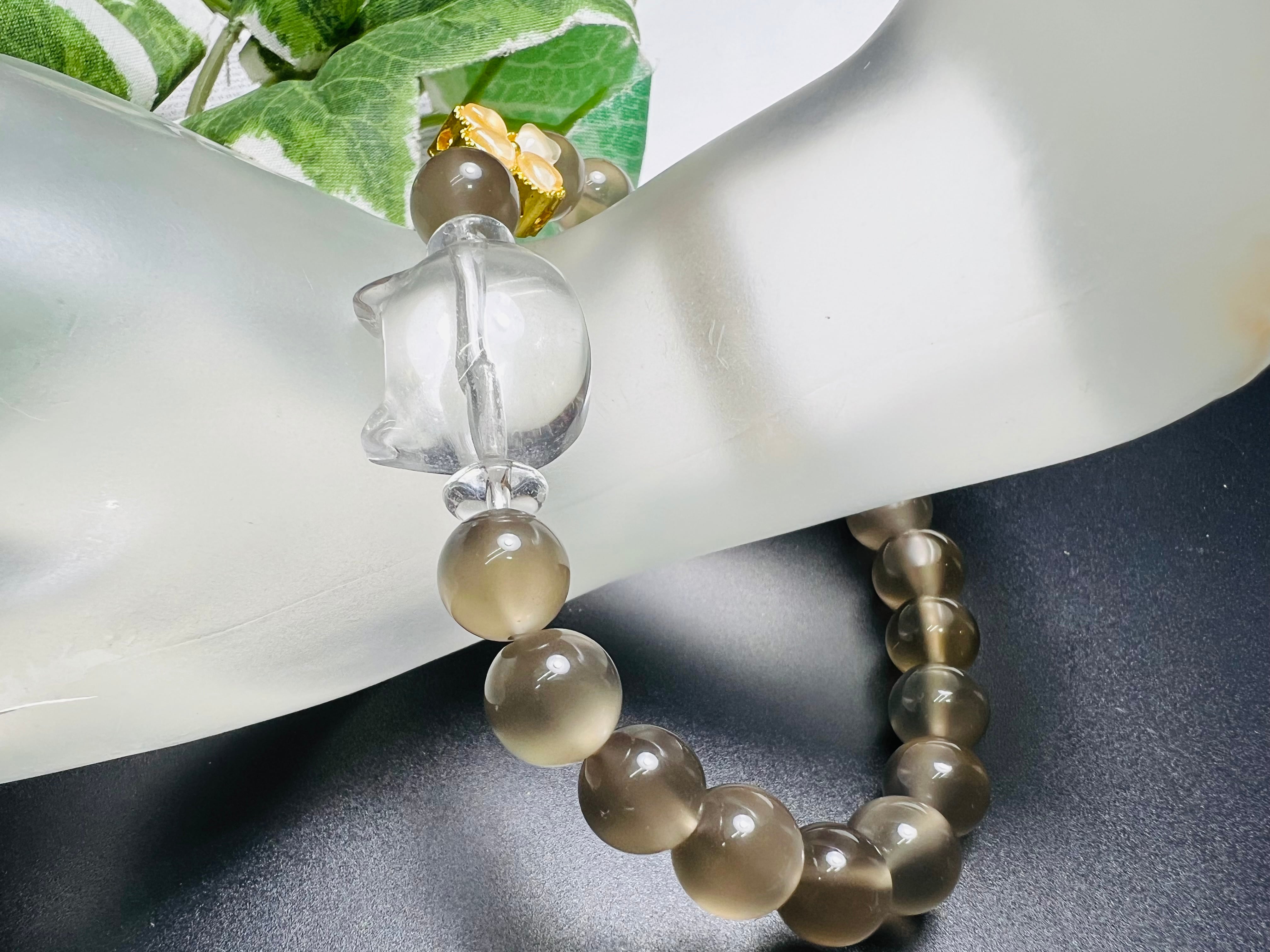 ブラックムーンストーンと水晶猫彫り 可愛い お洒落❣️